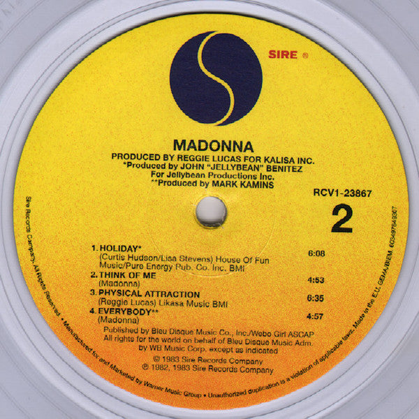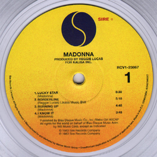 Sticker: "Madonna's 1983 DEBUT ALBUM 180-gram crystal clear vinyl includes Holiday Borderline Lucky Star"