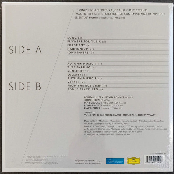 A1. Song 4:13 A2. Flowers For Yulia 6:50 A3. Fragment 1:42 A4. Harmonium 4:21 A5. Ionosphere 1:28 B1. Autumn Music 1 3:54 B2. Time Passing 1:51 B3. Sunlight 5:35 B4. Lullaby 0:53 B5. Autumn Music 2 3:49 B6. Verses 1:43 B7. From The Rue Vilin 1:02 . Bonus Track B8. Leo 2:26