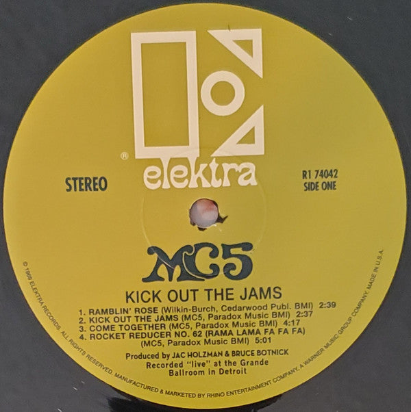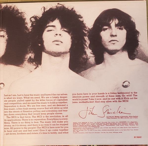 A1. Ramblin' Rose 2:39 A2. Kick Out The Jams 2:37 A3. Come Together 4:17 A4. Rocket Reducer No. 62 (Rama Lama Fa Fa Fa) 5:01 B1. Borderline 2:45 B2. Motor City Is Burning 4:30 B3. I Want You Right Now 6:02 B4. Starship 8:26