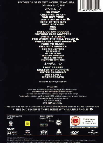 1-1. So What 1-2. Creeping Death 1-3. Sad But True 1-4. Ain't My Bitch 1-5. Hero Of The Day 1-6. King Nothing 1-7. One 1-8. Fuel 1-9. Bass/Guitar Doodle 1-10. Nothing Else Matters 1-11. Until It Sleeps 1-12. For Whom The Bell Tolls 1-13. Wherever I May Roam 1-14. Fade To Black 1-15. Kill/Ride Medley: Ride The Lightning, No Remorse, Hit The Lights, The Four Horsemen, Seek & Destroy, Fight Fire With Fire 2-1. Last Caress 2-2. Master Of Puppets 2-3. Enter Sandman 2-4. Am I Evil? 2-5. Motorbreath