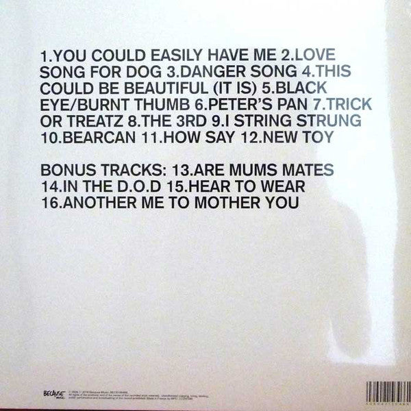 A1. You Could Easily Have Me 3:07 A2. Love Song For Dog 3:19 A3. Danger Song 4:41 A4. This Could Be Beautiful (It Is) 4:10 B1. Black Eye / Burnt Thumb 4:43 B2. Peter's Pan 5:22 B3. Trick Or Treatz 4:41 B4. The 3rd 3:56 C1. 1 String Strung 2:43 C2. Bearcan 6:38 C3. How Say 4:29 C4. New Toy 2:57 D1. Are Mums Mates 2:14 D2. In The D.O.D 3:18 D3. Hear To Wear 3:27 D4. Another Me To Mother You 4:14 . CD 1. You Could Easily Have Me 3:07 2. Love Song For Dog 3:19 3. Danger Song 4:41 4. This Could Be Beautiful (It Is) 4:10 5. Black Eye / Burnt Thumb 4:43 6. Peter's Pan 5:22 7. Trick Or Treatz 4:41 8. The 3rd 3:56 9. 1 String Strung 2:43 10. Bearcan 6:38 11. How Say 4:29 12. New Toy 2:57 13. Are Mums Mates 2:14 14. In The D.O.D 3:18 15. Hear To Wear 3:27 16. Another Me To Mother You 4:14