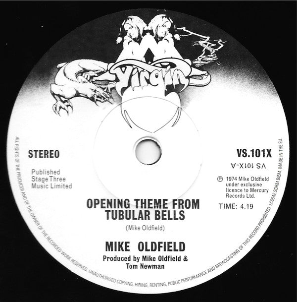Sleeve cover is identical to the original 1974 single but it contains different tracks. Side A is the opening theme of Tubular Bells, whereas the 1974 single contains the so called "Bagpipe Guitars" theme.