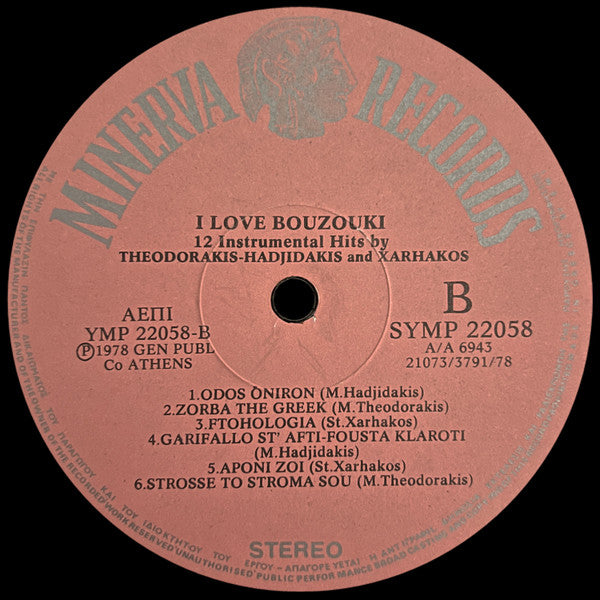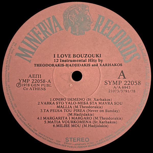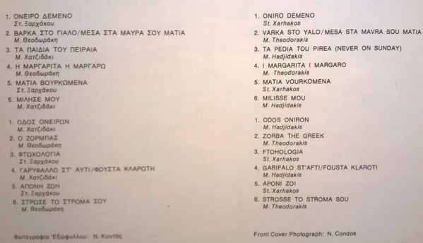 A1. Oniro Demeno A2. Varka Sto Yalo / Mesa Sta Mavra Sou Matia A3. Ta Pedia Tou Pirea = Never On Sunday A4. I Margarita I Margaro A5. Matia Vourkomena A6. Milisse Mou B1. Odos Oniron B2. Zorba The Greek B3. Ftohologia B4. Garifalo St' Afti / Fousta Klaroti B5. Aponi Zoi B6. Strosse To Stroma Sou