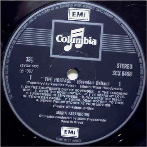 Mikis Theodorakis, Maria Farandouri - "The Hostage" (Brendan Behan) (LP, Album)