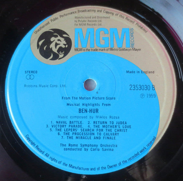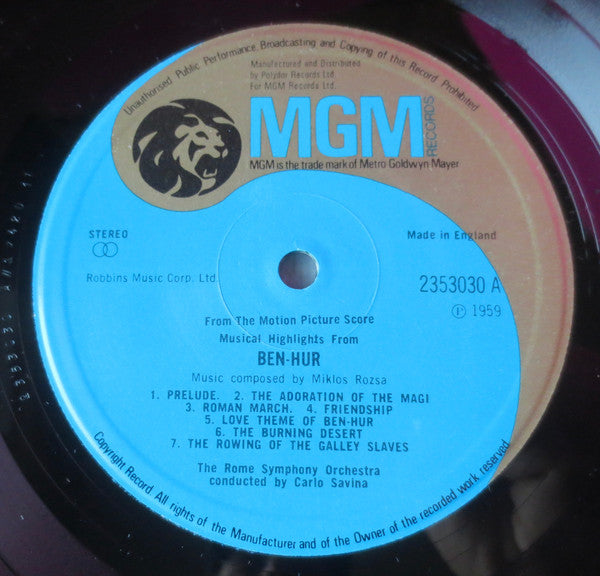 A1. Prelude A2. The Adoration Of The Magic A3. Roman March A4. Friendship A5. Love Theme Of Ben-Hur A6. The Burning Desert A7. The Rowing Of The Galley Slaves B1. Naval Battle B2. Return To Judea B3. Victory Parade B4. The Mother's Love B5. The Leper's Search For The Christ B6. The Procession To Calvary B7. The Miracle And Finale