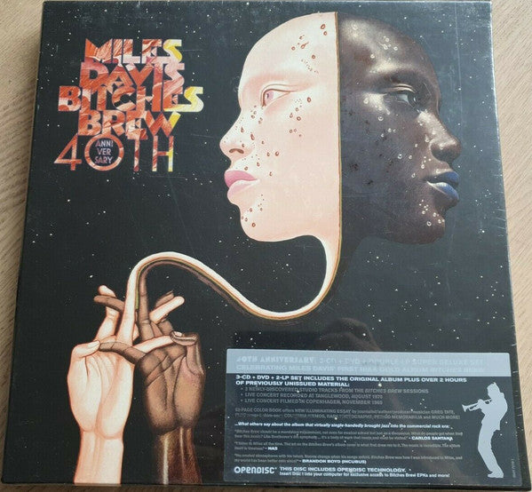 Includes a 52-page color 31,2 cm x 31,2 cm booklet with texts on the history of "Bitches Brew", producer's note, original album notes, photographs, original documents, like concert poster photo and letters, and several illustrations.