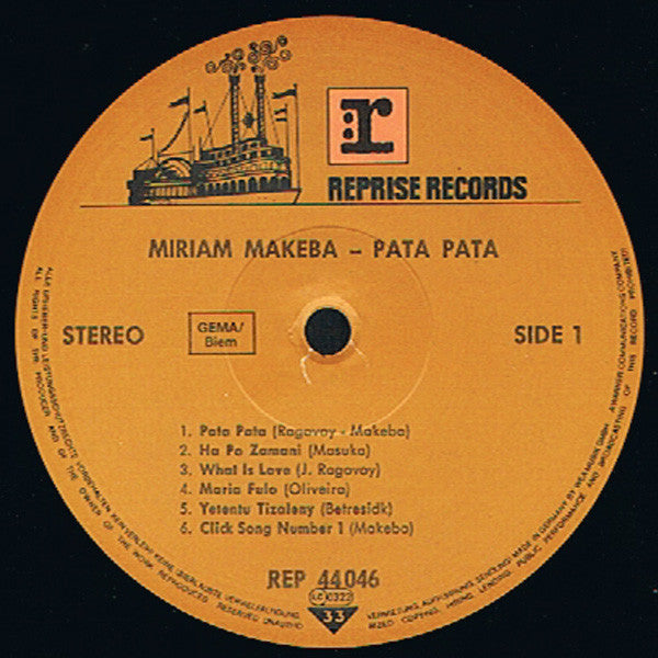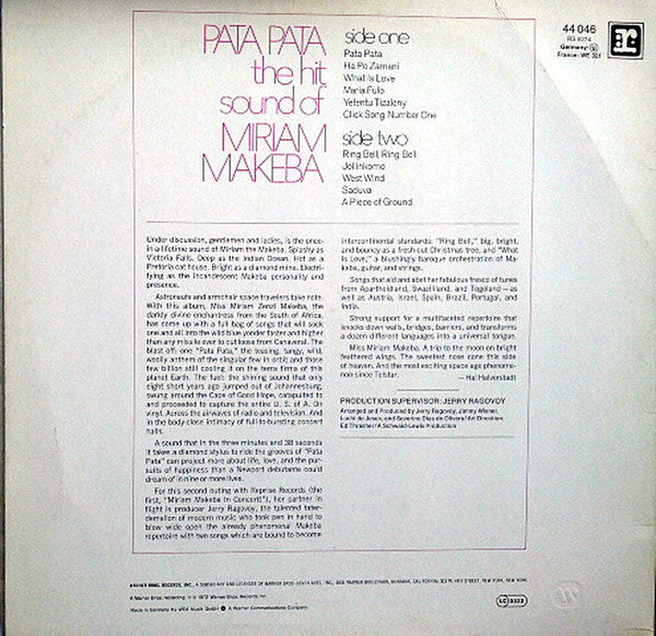 A1. Pata Pata 3:01 A2. Ha Po Zamani 2:57 A3. What Is Love 2:41 A4. Maria Fulo 2:38 A5. Yetentu Tizaleny 2:51 A6. Click Song Number One 2:18 B1. Ring Bell, Ring Bell 2:23 B2. Jol'inkomo 3:00 B3. West Wind 2:47 B4. Saduva 3:45 B5. A Piece Of Ground 3:38