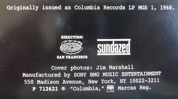 Sealed copies come with a black and purple "Moby Grape" logo sticker on front. All runout details are hand etched. [Rear jacket: Originally issued as Columbia Records LP MGS 1, 1968. Direction: [Matthew Katz Productions logo San Francisco ® "Columbia," [Columbia walking eye logo Marcas Reg. [Labels: Direction: Matthew Katz ®"Columbia", [Columbia walking eye logo Marcas Reg. Printed in U.S.A.