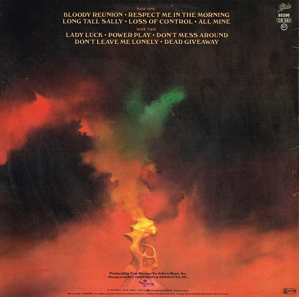 A1. Bloody Reunion 3:59 A2. Respect Me In The Morning 3:21 A3. Long Tall Sally 2:54 A4. Loss Of Control 3:30 A5. All Mine 4:00 B1. Lady Luck 3:34 B2. Power Play 3:49 B3. Don't Mess Around 3:00 B4. Don't Leave Me Lonely 3:58 B5. Dead Giveaway 3:24