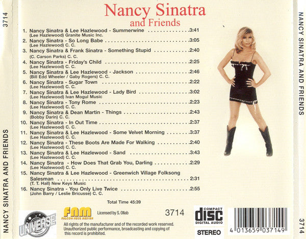 1. Nancy Sinatra & Lee Hazlewood - Summerwine 3:412. Nancy Sinatra - So Long Babe 3:053. Nancy Sinatra, Frank Sinatra - Something Stupid 2:404. Nancy Sinatra - Friday's Child 2:255. Nancy Sinatra & Lee Hazlewood - Jackson 2:466. Nancy Sinatra - Sugar Town 2:227. Nancy Sinatra & Lee Hazlewood - Lady Bird 3:028. Nancy Sinatra - Tony Rome 2:239. Nancy Sinatra, Dean Martin - Things 2:4310. Nancy Sinatra - In Out Time 2:3711. Nancy Sinatra & Lee Hazlewood - Some Velvet Morning 3:3712. Nancy Sinatra - These Boots Are Made For Walking 2:4013. Nancy Sinatra & Lee Hazlewood - Sand 3:4314. Nancy Sinatra - How Does That Grab You, Darling 2:2915. Nancy Sinatra & Lee Hazlewood - Greenwich Village Folksong Salesman 2:3116. Nancy Sinatra - You Only Live Twice 2:55