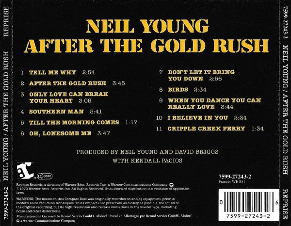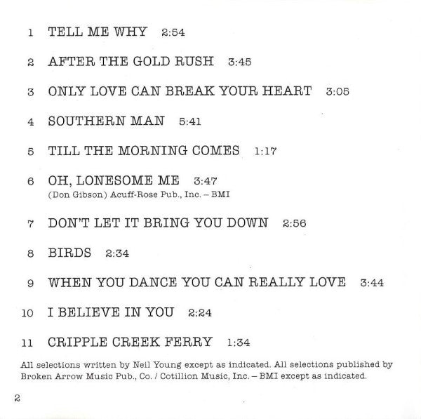 1. Tell Me Why 2:542. After The Gold Rush 3:453. Only Love Can Break Your Heart 3:054. Southern Man 5:415. Till The Morning Comes 1:176. Oh, Lonesome Me 3:477. Don't Let It Bring You Down 2:568. Birds 2:349. When You Dance You Can Really Love 3:4410. I Believe In You 2:2411. Cripple Creek Ferry 1:34