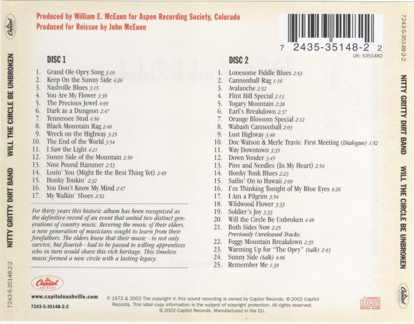 1-1. Grand Ole Opry Song 3:101-2. Keep On The Sunny Side 4:261-3. Nashville Blues 3:151-4. You Are My Flower 3:391-5. The Precious Jewel 4:091-6. Dark As A Dungeon 2:471-7. Tennessee Stud 4:501-8. Black Mountain Rag 2:401-9. Wreck On The Highway 3:251-10. The End Of The World 3:541-11. I Saw The Light 4:211-12. Sunny Side Of The Mountain 2:501-13. Nine Pound Hammer 2:531-14. Losin' You (Might Be The Best Thing Yet) 2:491-15. Honky Tonkin' 2:321-16. You Don't Know My Mind 2:471-17. My Walkin' Shoes 2:522-1. Lonesome Fiddle Blues 2:432-2. Cannonball Rag 1:162-3. Avalanche 2:522-4. Flint Hill Special 2:132-5. Togary Mountain 2:282-6. Earl's Breakdown 2:372-7. Orange Blossom Special 2:122-8. Wabash Cannonball 2:032-9. Lost Highway 3:482-10. Doc Watson & Merle Travis: First Meeting (Dialogue) 1:522-11. Way Downtown 3:352-12. Down Yonder 3:452-13. Pins And Needles (In My Heart) 2:542-14. Honky Tonk Blues 2:232-15. Sailin' On To Hawaii 2:092-16. I'm Thinking Tonight Of My Blue Eyes 4:262-17. I Am A Pilgrim 3:542-18. Wildwood Flower 3:332-19. Soldier's Joy 3:332-20. Will The Circle Be Unbroken 4:482-21. Both Sides Now 2:25. Previously Unreleased Tracks: 2-22. Foggy Mountain Breakdown 2:392-23. Warming Up For "Opry" (Talk) 2:432-24. Sunny Side (Talk) 4:062-25. Remember Me 1:39