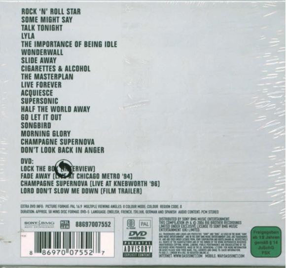 CD1.1. Rock 'N' Roll Star 5:20CD1.2. Some Might Say 5:10CD1.3. Talk Tonight 4:19CD1.4. Lyla 5:11CD1.5. The Importance Of Being Idle 3:41CD1.6. Wonderwall 4:18CD1.7. Slide Away 6:14CD1.8. Cigarettes & Alcohol 4:48CD1.9. The Masterplan 5:20CD2.1. Live Forever 4:36CD2.2. Acquiesce 4:23CD2.3. Supersonic 4:35CD2.4. Half The World Away 4:15CD2.5. Go Let It Out 4:41CD2.6. Songbird 2:05CD2.7. Morning Glory 5:01CD2.8. Champagne Supernova 7:29CD2.9. Don't Look Back In Anger 4:53DVD-1. Lock The Box (Interview) 39:09DVD-2. Fade Away (Live At Chicago Metro '94) 3:58DVD-3. Champagne Supernova (Live At Knebworth '96) 8:07DVD-4. Lord Don't Slow Me Down (Film Trailer) 4:30