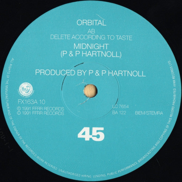 'All tracks written & produced by Orbital' is printed on the sleeve. 'Produced by P & P Hartnoll' and '(P & P Hartnoll)' indicating the writers are printed on the center labels. AA: The voice credited to Crucifix was in fact sampled from the intro to the track Annihilation on the Crucifix album Dehumanization ℗ 1991 FFRR Records © 1991 FFRR Records Marketed in France by Barclay and in Germany by Metronome Musik GmbH