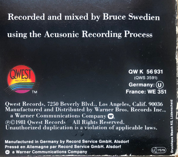 Recorded and mixed using the Acusonic Recording Process. B3 "Symphony Of Love" Dedicated to the memory of Bob Marley. ℗ © 1981 Qwest Records - Cat# on labels: QW 56 931 - Cat# on sleeve and inner sleeve: QW K 56 931 - US Cat#: QWS 3591 - Label code on labels: LC 7959 - Label code on back cover: LC 7579