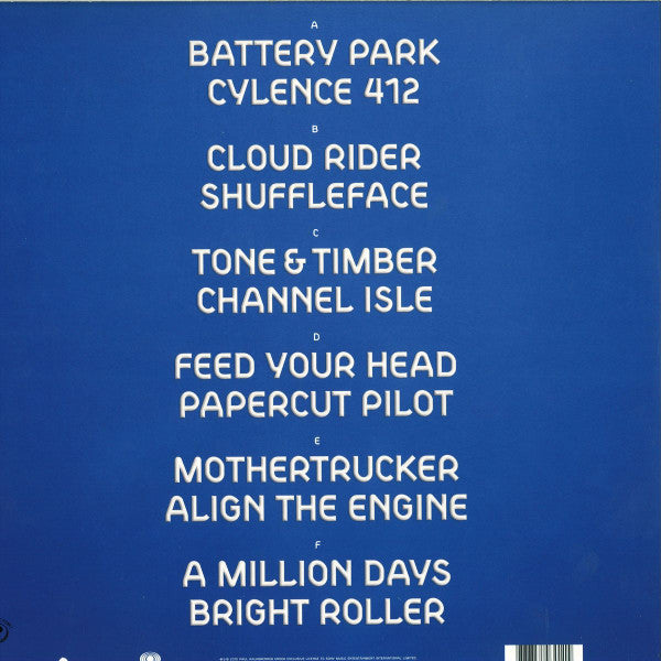 A1. Battery Park 4:59 A2. Cylence 412 4:25 B1. Cloud Rider 6:31 B2. Shuffleface 4:10 C1. Tone & Timber 5:25 C2. Channel Isle 3:15 D1. Feed Your Head 5:46 D2. Papercut Pilot 5:47 E1. Mothertrucker 5:17 E2. Align The Engine 5:46 F1. A Million Days 6:47 F2. Bright Roller 3:59 CD-1. Battery Park 4:59 CD-2. Cylence 412 4:25 CD-3. Cloud Rider 6:31 CD-4. Shuffleface 4:10 CD-5. Tone & Timber 5:25 CD-6. Channel Isle 3:15 CD-7. Feed Your Head 5:46 CD-8. Papercut Pilot 5:47 CD-9. Mothertrucker 5:17 CD-10. Align The Engine 5:46 CD-11. A Million Days 6:47 CD-12. Bright Roller 3:59