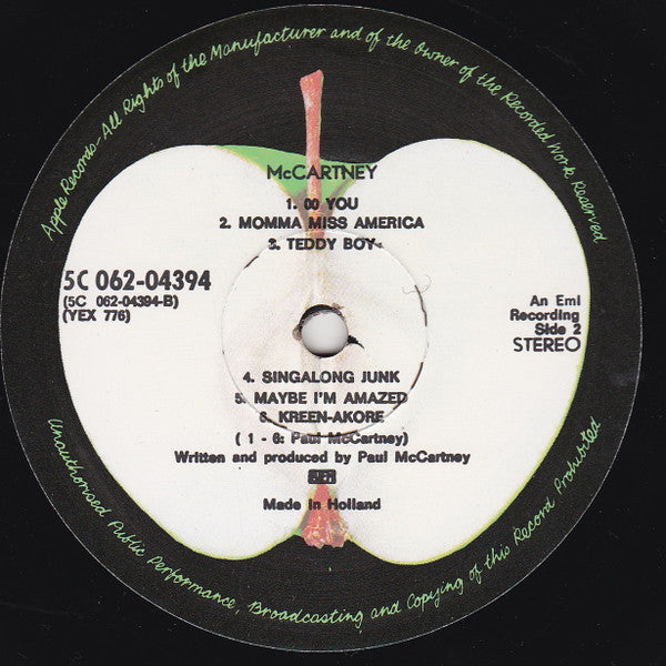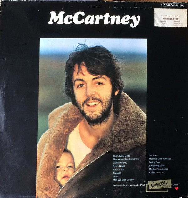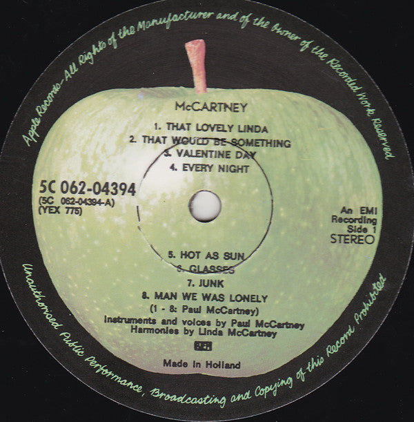 A1. The Lovely Linda 0:46 A2. That Would Be Something 2:43 A3. Valentine Day 1:44 A4. Every Night 2:40 A5. Hot As Sun / Glasses 2:08 A6. Junk 1:57 A7. Man We Was Lonely 3:00 B1. Oo You 2:50 B2. Momma Miss America 4:08 B3. Teddy Boy 2:25 B4. Singalong Junk 2:37 B5. Maybe I'm Amazed 3:54 B6. Kreen - Akrore 4:15