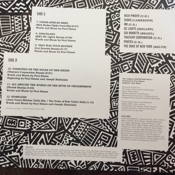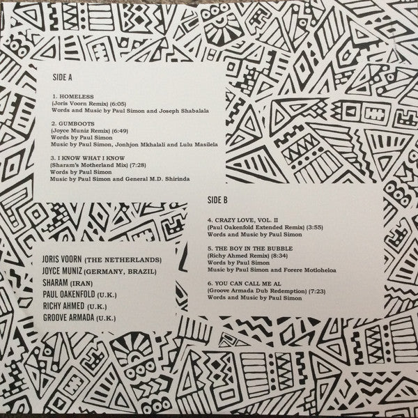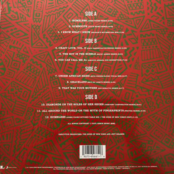 A1. Homeless (Joris Voorn Remix) 6:05 A2. Gumboots (Joyce Muniz Remix) 6:49 A3. I Know What I Know (Sharam's Motherland Mix) 7:28 B1. Crazy Love, Vol. II (Paul Oakenfold Extended Remix) 3:55 B2. The Boy In The Bubble (Richy Ahmed Remix) 8:34 B3. You Can Call Me Al (Groove Armada Dub Redemption) 7:23 C1. Under African Skies (Rich Pinder/Djoko Vocal Mix) 6:37 C2. Graceland (MK's KC Lights Remix) 4:46 C3. That Was Your Mother (Gui Boratto Remix) 6:17 D1. Diamonds On The Soles Of Her Shoes (Thievery Corporation Remix) 6:01 D2. All Around The World Or The Myth Of Fingerprints (Photek Remix) 4:35 D3. Homeless (Joris Voorn Kitchen Table Mix / The Duke Of New York's Edit) 1:13