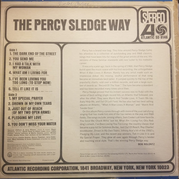 A1. The Dark End Of The Street 2:43 A2. You Send Me 3:05 A3. I Had A Talk With My Woman 3:20 A4. What Am I Living For 2:28 A5. I've Been Loving You Too Long 2:43 A6. Tell It Like It Is 2:54 B1. My Special Prayer 2:58 B2. Drown In My Own Tears 3:57 B3. Just Out Of Reach 3:29 B4. Pledging My Love 2:50 B5. You Don't Miss Your Water 3:00