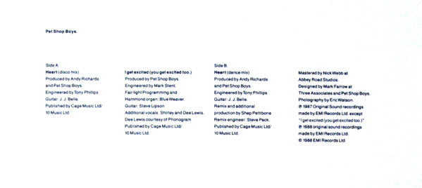 Chris Lowe Picture Sleeve. Published by Cage Music Ltd/10 Music Ltd. Dee Lewis courtesy of Phonogram. Mastered at Abbey Road Studios. ℗1987 Original sound recordings made by EMI Records Ltd. except "I Get Excited (You Get Excited Too.)" ℗1988 Original sound recordings made by EMI Records Ltd. ©1988 EMI Records Ltd. Released in a choice of two picture sleeves, featuring either Neil Tennant or Chris Lowe.