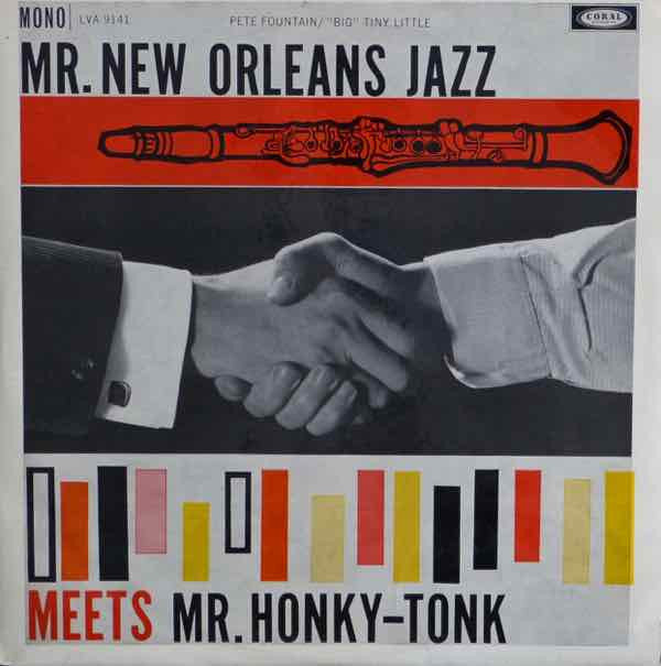 Different cover design - front cover is modern art influenced - four horizontal bands - top and bottom light grey with text, 2nd from top red (with clarinet), other B&W photo of two hands shaking.