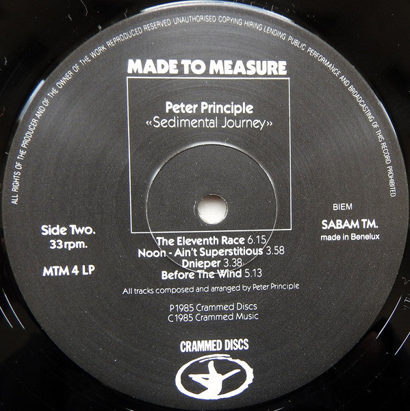 Completed January 1985 at Daylight Studio - Brussels. Tracks A2, A3, A4 and B4 based on soundtrack music for video film "Pandemonium" by Saskia Lupini. Made Against Measure P 1985 Crammed Discs C 1985 Crammed Music Made in Benelux (on labels) Made in Belgium (on sleeve) Catalog# "MTM 4 LP" on back cover and labels, "MTM4" on spine "Noon" and "Ain't Superstitious" listed on back cover as separate tracks B2 and B3.