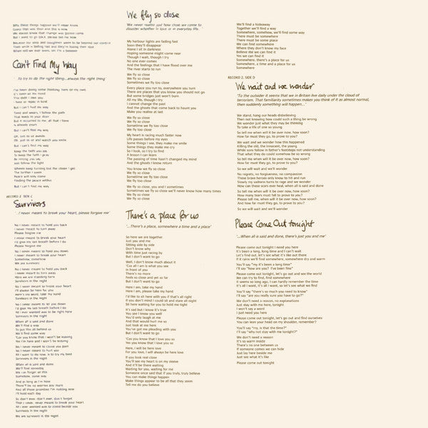 A1. Both Sides Of The Story A2. Can't Turn Back The Years A3. Everyday B1. I've Forgotten Everything B2. We're Sons Of Our Fathers B3. Can't Find My Way C1. Survivors C2. We Fly So Close C3. There's A Place For Us D1. We Wait And We Wonder D2. Please Come Out Tonight