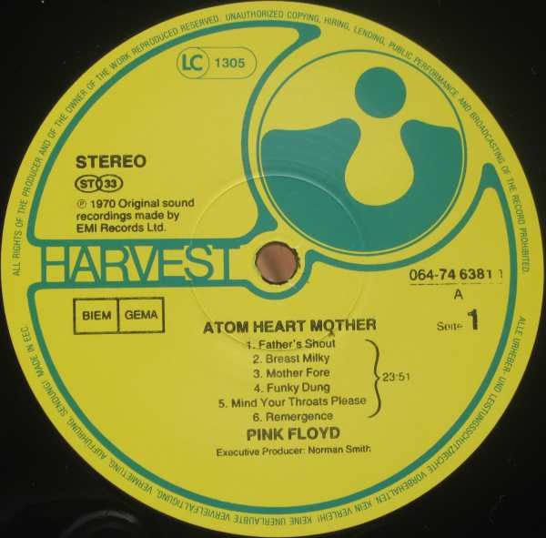 Label lists "Atom Heart Mother" unnumbered and subtracks as 1 to 6.