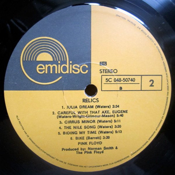 Cat.# 5C 048-50740 on labels. Cat.# C 048-50 740 on sleeve. Printed on label side B: Produced by Norman Smith & The Pink Floyd Printed on the back sleeve: EMIDISC is a product of EMI-Group Companies issued in Germany by ELECTROLA GmbH., Köln, in Netherlands by N.V. BOVEMA, Heemstede. Tracks A1 and A3 are mono recordings electronically reprocessed to give a stereo effect on stereo equipment. Semi-laminated sleeve. Includes a yellow Emidisc inner sleeve. Initial Dutch version with rights society BIEM There is a very similar repress version with STEMRA instead, see [r1103204
