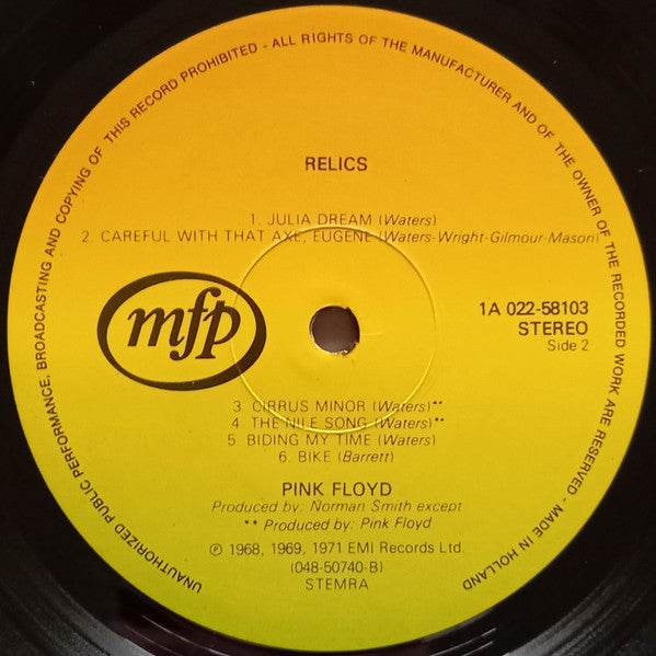 A1. Arnold Layne 2:52 A2. Interstellar Overdrive 9:38 A3. See Emily Play 2:54 A4. Remember A Day 4:28 A5. Paintbox 3:35 B1. Julia Dream 2:35 B2. Careful With That Axe, Eugene 7:45 B3. Cirrus Minor 5:13 B4. The Nile Song 3:23 B5. Biding My Time 5:16 B6. Bike 3:21