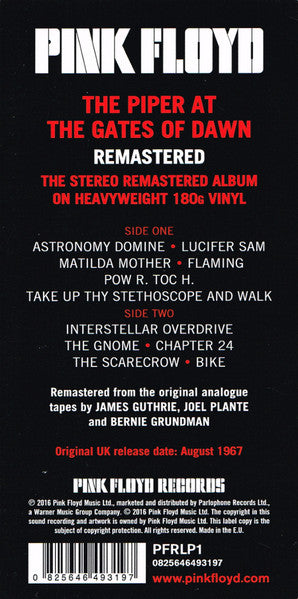 A1. Astronomy Dominé A2. Lucifer Sam A3. Matilda Mother A4. Flaming A5. Pow R. Toc H. A6. Take Up Thy Stethoscope And Walk B1. Interstellar Overdrive B2. The Gnome B3. Chapter 24 B4. The Scarecrow B5. Bike