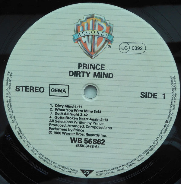 A1. Dirty Mind 4:11 A2. When You Were Mine 3:44 A3. Do It All Night 3:42 A4. Gotta Broken Heart Again 2:13 B1. Uptown 5:30 B2. Head 4:40 B3. Sister 1:33 B4. Partyup 4:24