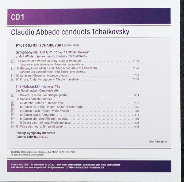 . Symphony No. 1 In G Minor, Op. 13 'Winter Daydreams' 43:33. The Nutcracker Suite, Op. 71a (Ballet Suite) 21:412-1. The Tempest, Op. 18 21:57. Symphony No. 2 In C Minor, Op. 17 'Little Russian' 33:34. Symphony No. 3 In D Major, Op. 29 'Polish' 44:25. 1812 Overture, Op. 49 14:32. Symphony No. 4 In F Minor, Op. 36 44:134-5. Romeo & Juliet - Fantasy Overture 20:32. Symphony No. 5 In E Minor, Op. 64 45:255-5. The Voyevoda, Symphonic Ballad Op. 78 11:31. Symphony No. 6 In B Minor, Op. 74 'Pathétique' 43:246-5. Marche Slave, Op. 31 10:10