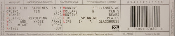 A1. Packt Like Sardines In A Crushd Tin Box A2. Pyramid Song A3. Pulk/Pull Revolving Doors B1. You And Whose Army? B2. I Might Be Wrong C1. Knives Out C2. Morning Bell/Amnesiac C3. Dollars & Cents D1. Hunting Bears D2. Like Spinning Plates D3. Life In A Glasshouse