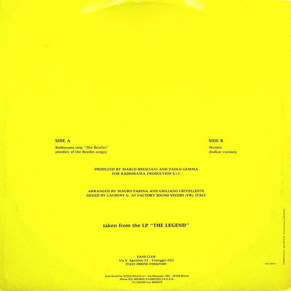 Produced for Radiorama Production S.r.l. Mixed at Factory Sound Studio (VR), Italy Published by (Edizioni): SBK Song * Edition Accord (tracks side A) & Lombardoni (track side B) Distributed by Disco Magic srl - Via Mecenate, 78A - 20138 Milano Cover at Studio Forneris (VR) Italy Taken from the LP "The Legend"