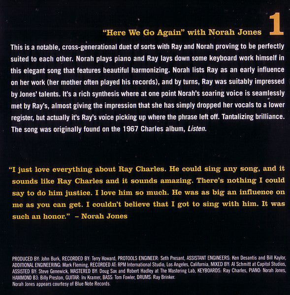 1. Ray Charles, Norah Jones - Here We Go Again 3:592. Ray Charles, James Taylor (2) - Sweet Potato Pie 3:473. Ray Charles, Diana Krall - You Don't Know Me 3:554. Ray Charles, Elton John - Sorry Seems To Be The Hardest Word 3:595. Ray Charles, Natalie Cole - Fever 3:306. Ray Charles, Bonnie Raitt - Do I Ever Cross Your Mind? 4:347. Ray Charles, Willie Nelson - It Was A Very Good Year 4:598. Ray Charles, Michael McDonald - Hey Girl 5:159. Ray Charles, B.B. King - Sinner's Prayer 4:2510. Ray Charles, Gladys Knight - Heaven Help Us All 4:3211. Ray Charles, Johnny Mathis - Over The Rainbow 4:5412. Ray Charles, Van Morrison - Crazy Love (Live) 3:46