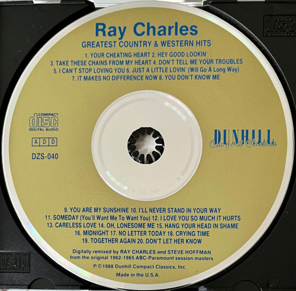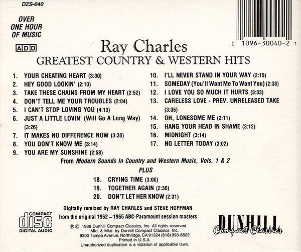 Phonographic Copyright (p) Dunhill Compact Classics, Inc. Copyright (c) Dunhill Compact Classics, Inc. Remixed At RPM International Studios Mastered At Future Disc Manufactured By Dunhill Compact Classics, Inc. Marketed By Dunhill Compact Classics, Inc. Licensed From Ray Charles Made By PDO, USA