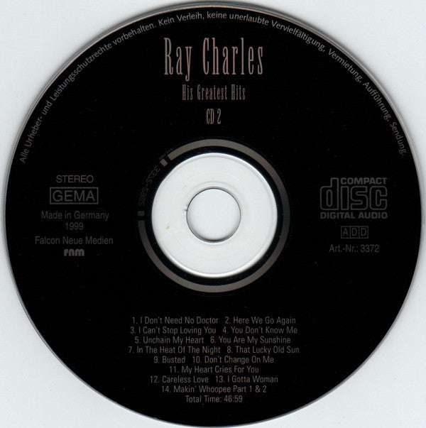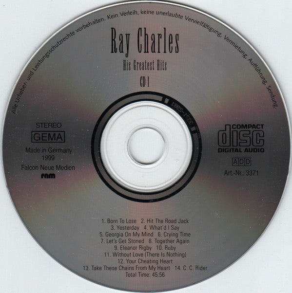 1-1. Born To Lose 3:131-2. Hit The Road Jack 1:571-3. Yesterday 2:461-4. What I'd Say 6:281-5. Georgia On My Mind 3:371-6. Crying Time 2:551-7. Let's Get Stoned 2:571-8. Together Again 2:381-9. Eleanor Rigby 2:561-10. Ruby 3:511-11. Without Love (There Is Nothing) 3:331-12. Your Cheating Heart 3:321-13. Take These Chains From My Heart 2:541-14. C. C. Rider 2:392-1. I Don't Need A Doctor 2:452-2. Here We Go Again 3:172-3. I Can't Stop Loving You 4:112-4. You Don't Know Me 3:132-5. Unchain My Heart 2:492-6. You Are My Sunshine 2:532-7. In The Heart Of The Night 2:342-8. That Lucky Old Sun 4:192-9. Busted 2:092-10. Don't Change On Me 3:032-11. My Heart Cries For You 2:472-12. Careless Love 3:522-13. I Gotta Woman 2:492-14. Makin' Whoopee Part 1 & 2 6:18