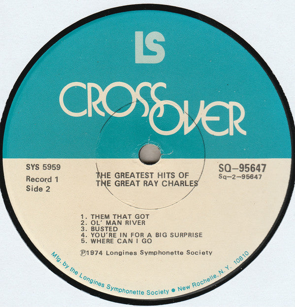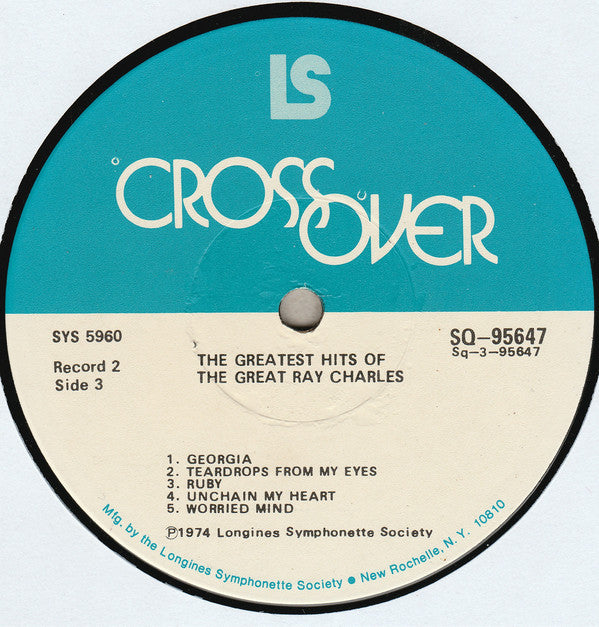 Box cover reads: "The Longines Symphonette Society Proudly Presents The Greatest Hits Of The Great Ray Charles" Blue & white labels with record # & side # on each one