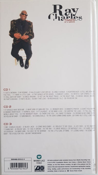 1-1. I Got A Woman 1-2. My Bonnie 1-3. Hallelujah I Love Her So 1-4. Lonely Avenue 1-5. Heartbreaker 1-6. Tell Me How Do You Feel 1-7. I Want A Little Girl 1-8. The Genius After Hours 1-9. Nobody Cares 1-10. What I'D Say (Part 1 & 2) 1-11. Roll With My Baby 1-12. Mess Around 1-13. Get On The Right Track 1-14. The Right Time 1-15. Music, music, music 1-16. That's Enough 1-17. Ray's Blues 1-18 . Ain't That Love 1-19. Rockhouse 1-20. I'm Moving On 2-1. It Should Have Been Me 2-2. What Kind Of Man Are You 2-3. I Wonder Who 2-4. Sinner's Prayer 2-5. Don't You Know 2-6. Swanee River Rock 2-7. Hornful Soul 2-8. It's Alright 2-9. The Man I Love 2-10. Carryin' The Load 2-11. Tell All The World About You 2-12. The Midnight Hour 2-13. There's No You 2-14. I Want You Know 2-15. Drown In My Own Tears 2-16. You Be My Baby 2-17. Greenbacks 2-18. Charlesville 2-19. The Sun's Gonna Shine Again 2-20. Funny But I Still Love You 3-1. Mr. Charles Blues 3-2. Black Jack 3-3. Come Back Baby 3-4. I Believe To My Soul 3-5. Joy Ride 3-6. Yes Indeed 3-7. Dawn Ray 3-8. Feelin' Bad 3-9. I Had a Dream 3-10. The Ray 3-11. What Would I Do Without You 3-12. Hard Times 3-13. Doodlin' 3-14. Mary Ann 3-15. Early In The Mornin' 3-16. The Little Girl Of Mine 3-17. Losing Hand 3-18. Some Day Baby 3-19. A Fool For You 3-20. Ain't Misbehavin'