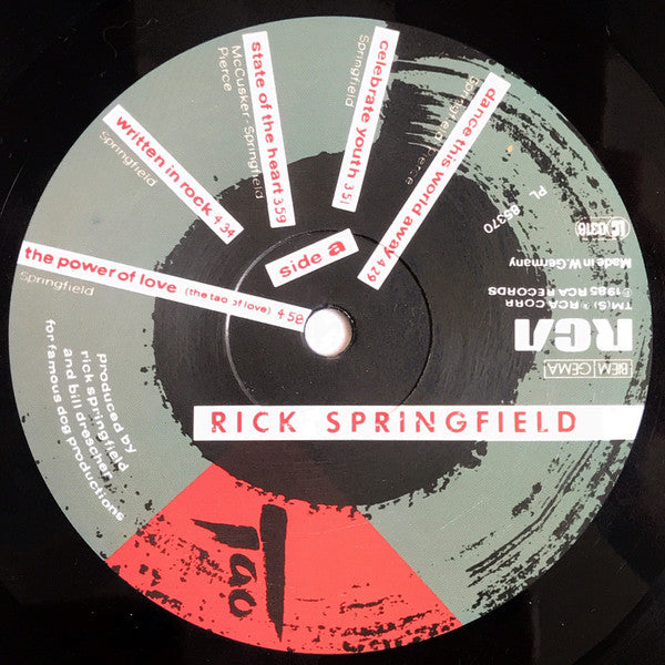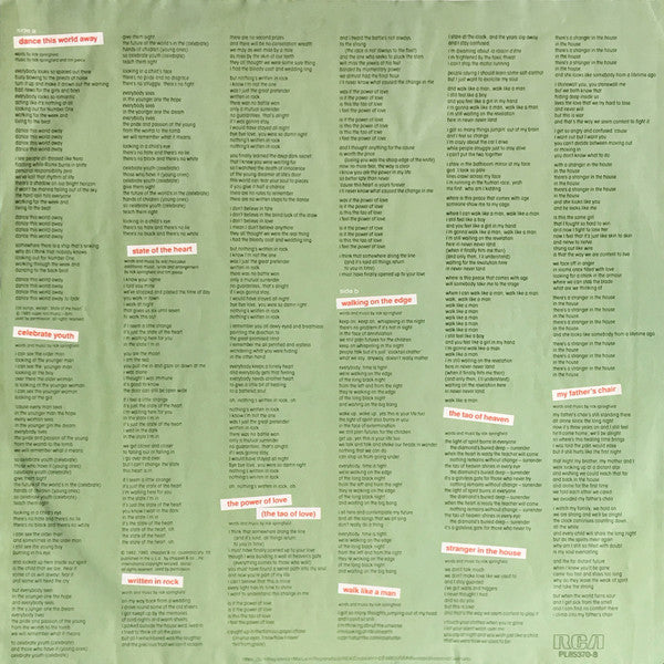 A1. Dance This World Away 4:29 A2. Celebrate Youth 3:51 A3. State Of The Heart 3:59 A4. Written In Rock 4:34 A5. The Power Of Love 4:58 B1. Walking On The Edge 5:09 B2. Walk Like A Man 4:12 B3. The Tao Of Heaven 1:26 B4. My Father's Chair 3:23 B5. Stranger In The House 4:01