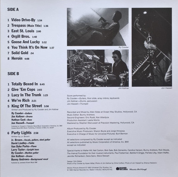 A1. Video Drive-By 1:54 A2. Trespass (Main Title) 1:36 A3. East St. Louis 2:00 A4. Orgill Bros. 1:40 A5. Goose And Lucky 3:32 A6. You Think It's On Now 1:37 A7. Solid Gold 0:54 A8. Heroin 4:08 B1. Totally Boxed In 6:45 B2. Give Em Cops 2:03 B3. Lucy In The Trunk 1:23 B4. We're Rich 2:21 B5. King Of The Street 3:58 B6. Party Light 2:58