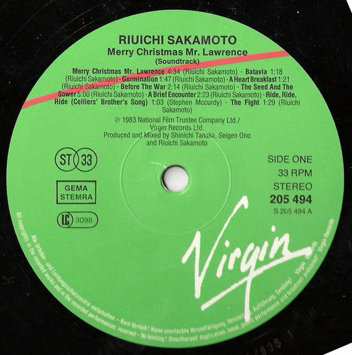 Soundtrack from the Motion Picture "Merry Christmas Mr. Lawrence" A Jeremy Thomas Production. A film by [a1674407. Music recorded and mixed at Onkio Haus, Tokyo Recording supervised for Yoroshita Music Inc. ℗ & © 1983 National Film Trustee Company Ltd./Virgin Records Ltd. Printed in Western Germany by Mohndruck Graphische Betriebe GmbH, Gütersloh Also released with GEMA STEMRA BIEM on labels