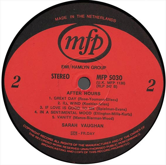 On back cover: This original mono recording has been electronically rechannelled to give a stereo effect. Manufactured by EMI Made in Holland On top of the labels: Made in the Netherlands Track A1 is not "Stella by starlight" (back cover), but "My favourite things" (label A). Due to the BIEM right society release approximately 1969/70, see also the flipback cover that was in use till then.