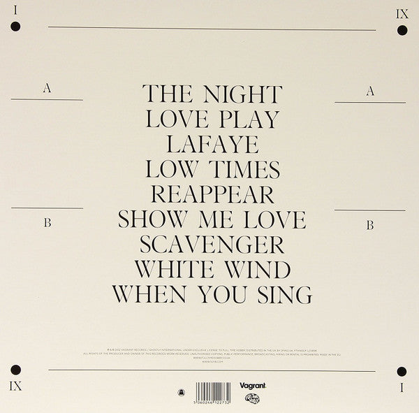 A1. The Night 3:48 A2. Love Play 4:12 A3. Lafaye 4:14 A4. Low Times 6:32 A5. Reappear 4:10 B1. Show Me Love 4:44 B2. Scavenger 4:26 B3. White Wind 4:42 B4. When You Sing 8:34