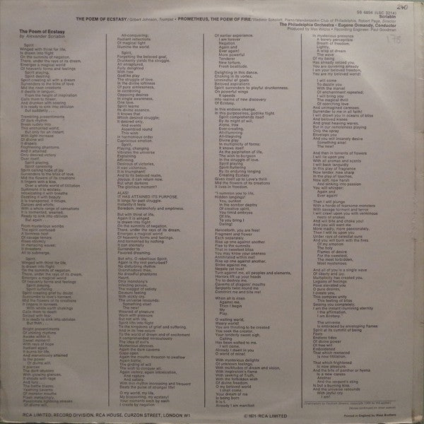 Alexander Scriabin / The Philadelphia Orchestra, Eugene Ormandy, Gilbert Johnson, Vladimir Sokoloff - The Poem Of Ecstasy / Prometheus, The Poem Of Fire (LP)