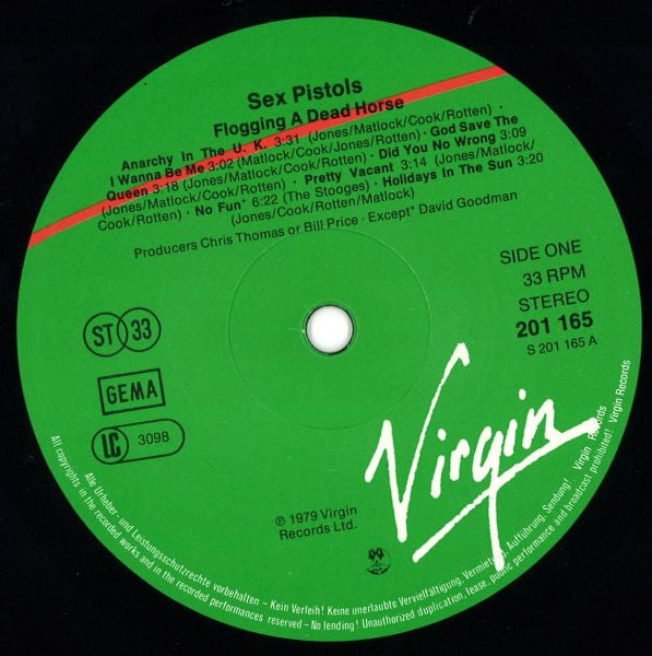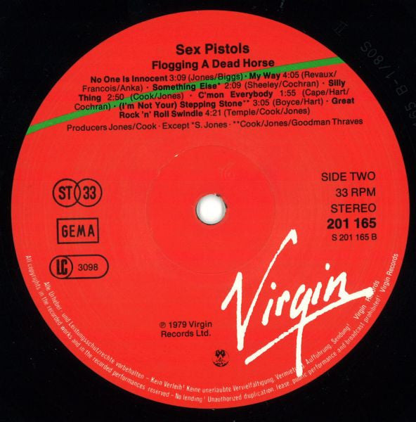 ℗ 1979 Virgin Records Ltd. Green/Red Labels. Copyright warning in German and English around labels circumference. Im Ariola-Vertrieb.