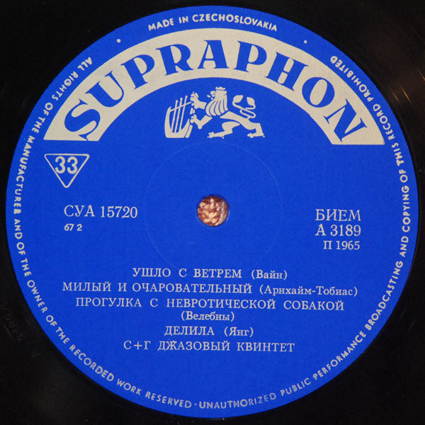 Originally released in 1965 as “SH kvintet”, Supraphon DV 10164 (mono) and SV 9003 (stereo), in a random neutral preprinted sleeve, with Czech track titles: Odváto sněhem, Sladce a líbezně, Vycházka s neurotickým psem, Dalila, Vyznání, Noc u gramofonu, Jdu si zarybařit, Jordu.
