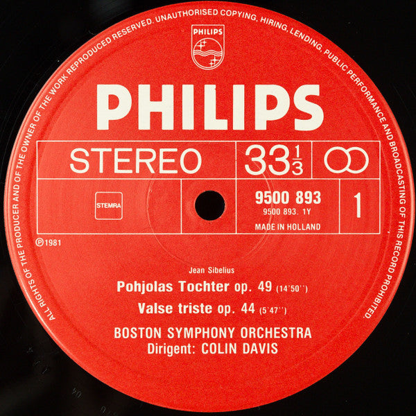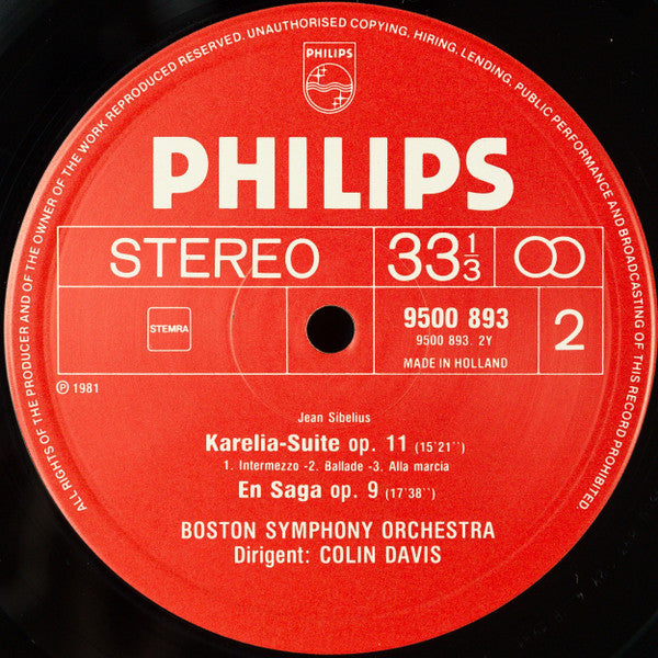 White font on red label with "All rights of the producer and of the owner of the work reproduced reserved. Unauthorised copying, hiring, lending, public performance and broadcasting of this record prohibited." rim text. Raised rim pressing ring. MADE IN HOLLAND in small font. Cover text in English, German and French
