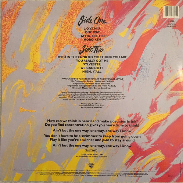 A1. L.O.V.I.N.U. 4:39 A2. One Way 4:26 A3. Ha Ha, Hee Hee 3:53 A4. Hobo Ken 2:38 B1. Who In The Funk Do You Think You Are 4:34 B2. You Really Got Me 3:51 B3. Sylvester 0:44 B4. We Can Do It 3:45 B5. High, Y'All 5:45